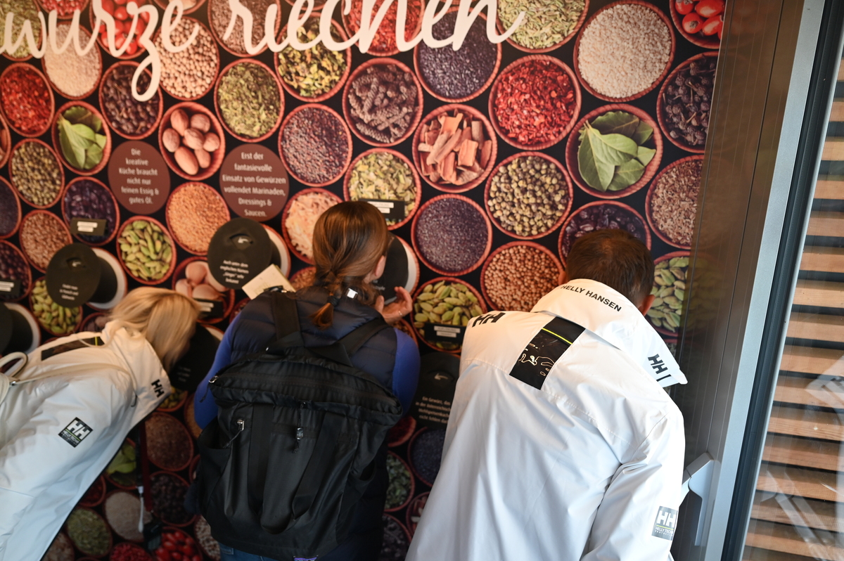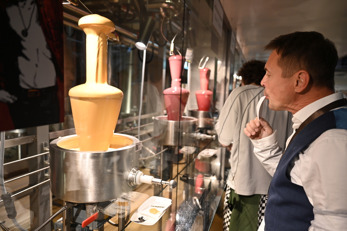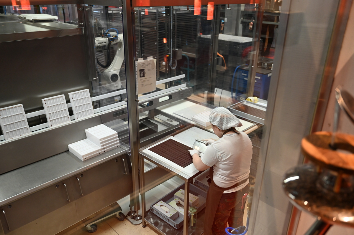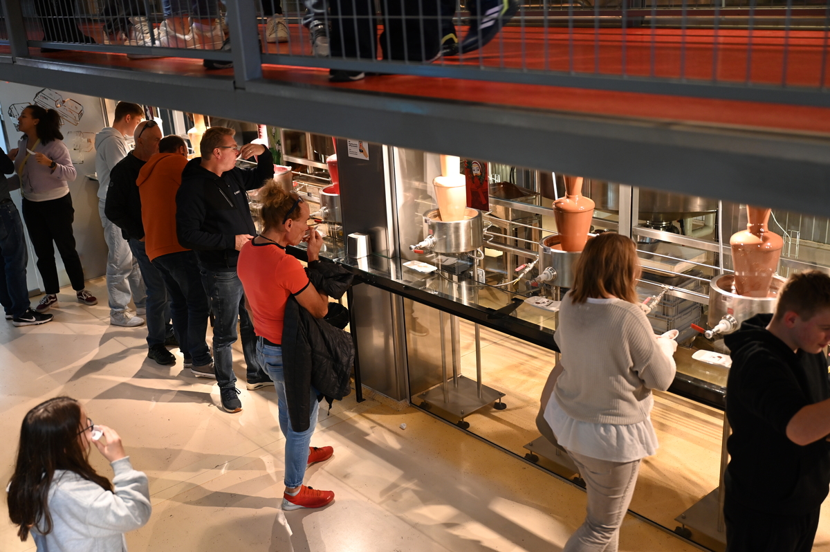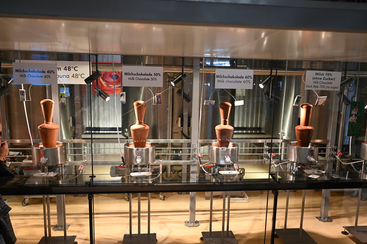 Nato pa že naprej v drugo stavbo, kjer smo vohali različne začimbe in opazovali proizvodnjo kako izdelujejo čokolado. Tam smo lahko pojedli še neskončno veliko čokolade. Če smo prej imeli okoli 30 različnih vrst, je potem za tukaj ostalo še skoraj 270 različnih. Čokolade različnih oblik, velikosti in okusov. Poizkusili smo lahko tudi čokolado z dodatki, čokoladne kokice, likerje in žganja s čokolado (viski, gin, vodka…) – seveda le polnoletni ter mnogo več. Zelo zanimivi so bili tudi stroji, ki so izgledali podobno kot pri žrebanju Lotto kroglic. Poleg vsega že naštetega smo lahko občudovali razgled na živalski vrt, ki je tudi v slopu čokoladnice ter se zabavali ob dveh robotih, ki sta ob ukazu podarila željen košček čokolade in zraven še malo zaplesala. Dovolj je bilo. Dovolj sladkega, dovolj čokolade. S tem prepričanjem smo se po stopnicah podali naprej proti izhodu. A ne – nismo še bili tam. Prišli smo v naslednjo sobo, kjer smo lahko degustirali neomejeno količino čokoladnih napitkov z različnimi okusi – daleč najboljši je bil napitek bele čokolade, na voljo pa je bila tudi voda s kisom, saj očitno pomaga pri prebavi čokolade. Ganache, pralineje in nenavadne kombinacije smo poizkusili in čakala nas je le še ena soba, enako kot do sedaj – soba čokolade. Tudi po stopnicah je bila in tudi tam si jo lahko še poizkusil.
