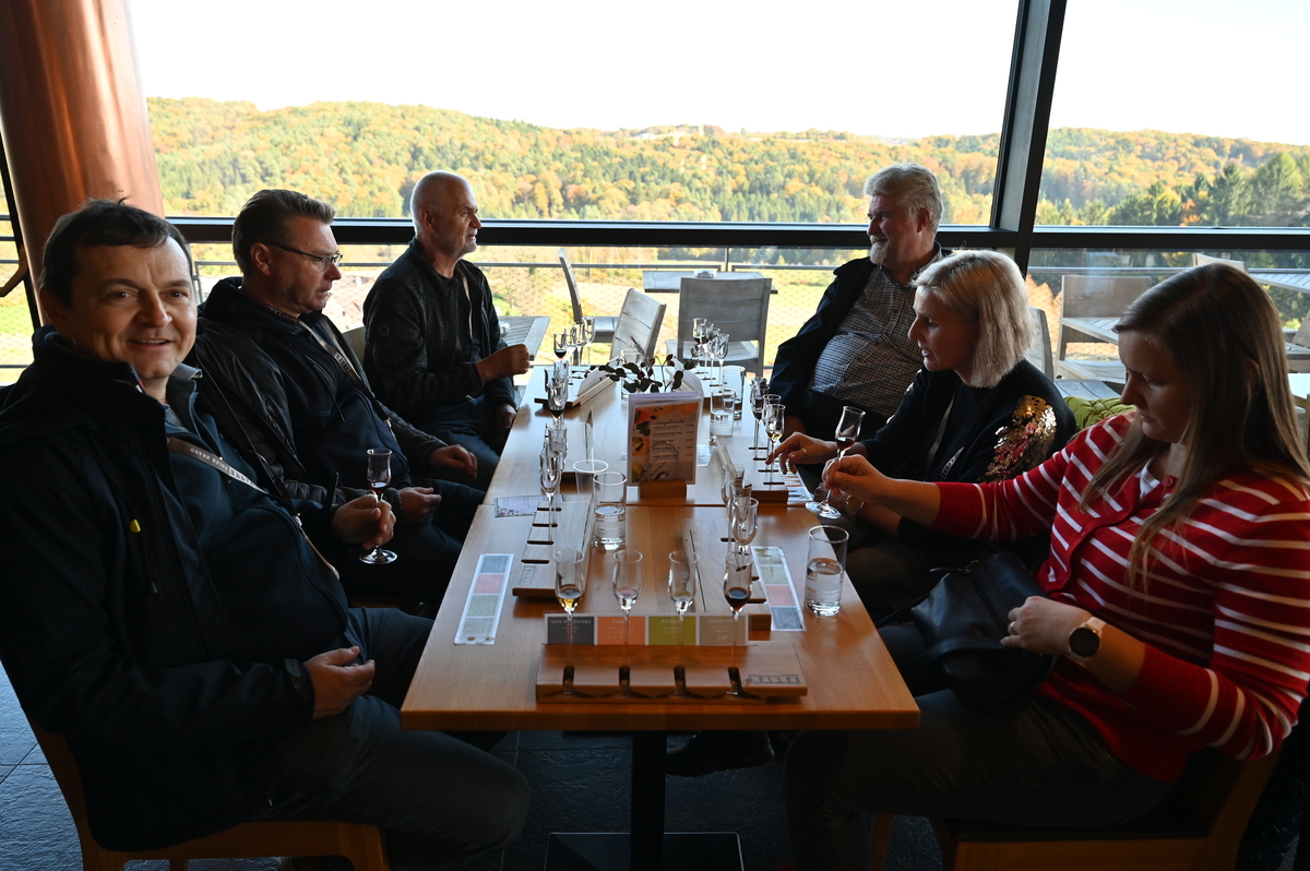 Po dobri uri vožnje smo prispeli do proizvodnje žganja in kisa Gölles Schnapps Distillery & Vinegar Production. Najprej smo si ogledali pridelavo kisa, načine predelave različnega sadja, si ogledali zanimiv videoposnetek kako pridelajo kis in žganje, nato pa se odpravili na še bolj zanimivi del, kjer smo lahko preizkušali različne kise. Od kislih do malo slajših. Najprej le po vonju, nato še po okusu. Ob začetku je vsak udeleženec dobil svojo žličko, ki jo je celotno pot uporabljal za poizkušanje različnih okusov. Nekateri z boljšimi sposobnostmi za vonj in okus, so poskušali brez napisov ugotoviti kater izmed vrst kisa pripada kateremu vonju in okusu. Med najboljšimi kisi čisto na koncu so bili seveda balzamični – veliko slajši kot ostali. Tam smo se zadržali malo dlje, saj so brbončice želele še in še… Shranili smo si še nekaj receptov in si za konec ogledali žganjekuho. Za nepolnoletne otroke je bil to konec ogleda, čas za igro, uživanje na lepi terasi, igralih in lepem razgledu, vse ostale pa je čakal še zadnji del, kjer so poizkušali različna žganja.