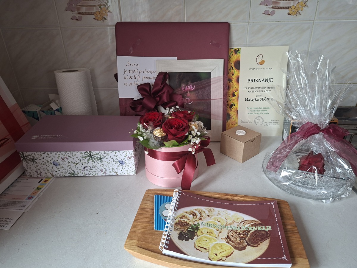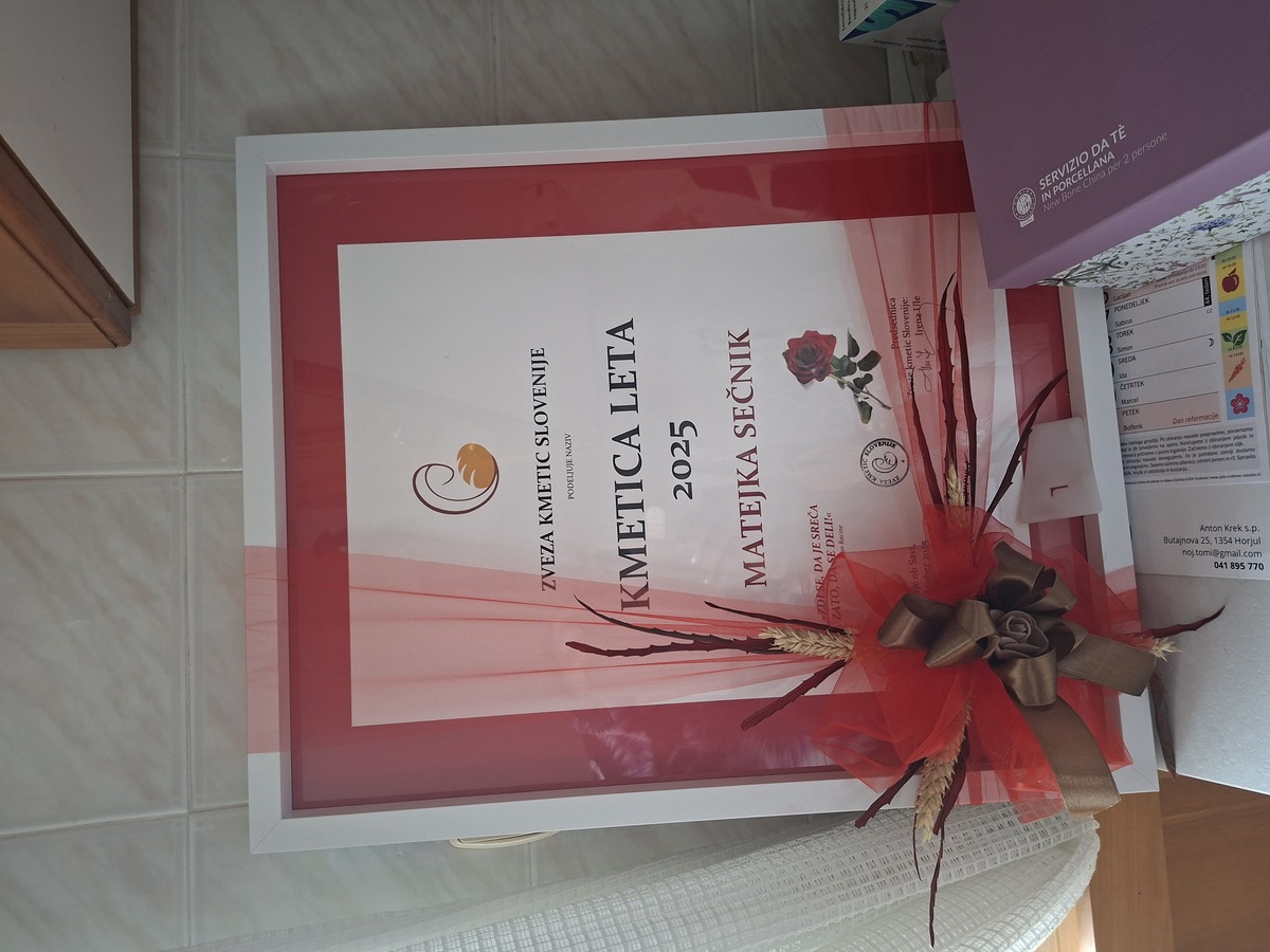 Na podelitvi sem prejela plaketo, broško in srebrnik, pa tudi ogromno šopkov in daril. Vsaka kmetica, ki je bila pred mano izbrana za kmetico leta, mi je prinesla darilo – nekaj malega iz svoje kmetije ali kraja. Od kmečkih žena sem dobila predpasnik in rožo. Kasneje so me prišle obiskat tudi članice društva, da smo skupaj malo predebatirale, kako naprej. Pred kratkim smo imele še sestanek v gasilskem domu – zdaj se pripravljamo na nove izzive.